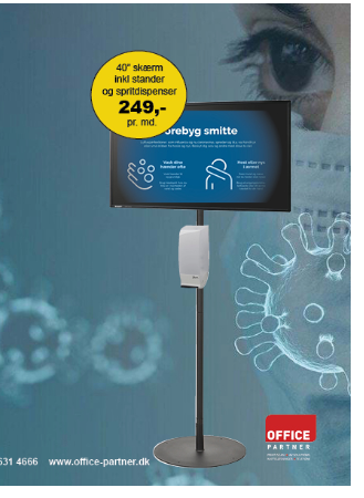 Ved opsætning af vores desinfektionsstander i fællesområder som f.eks ved indgangen, i kantinen, toiletter, mv. vil dine ansatte, kunder og gæster i virksomheden hele tiden blive opfordret via den indbyggede infoskærm til, at optimere deres hygiejne ved, at bruge håndsprit dispenser og dermed forebygge smitte og spredning af vira mm.