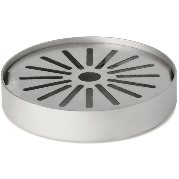 Rund drypbakke uden afløb i rustfrit stål. Drypbakken er fritstående og kan derfor nemt placeres efter behov.