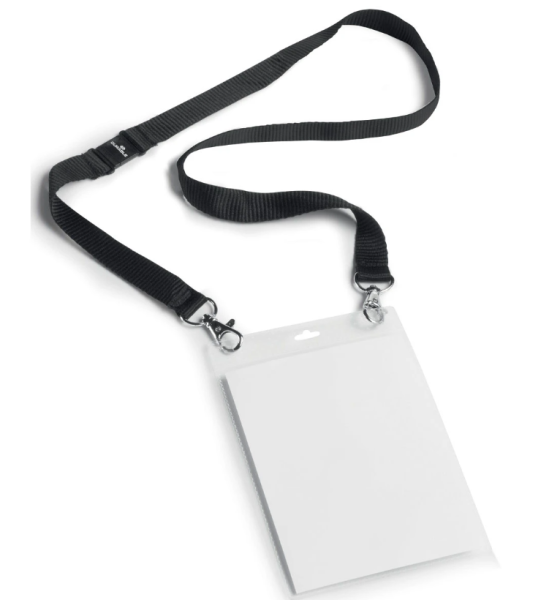 Et klassisk kongresmærke med sort tekstilhalsbånd i et enkelt design. Durable navneskiltet er med A6 højformat, og skaber med garanti et godt indtryk til konferencer, arrangementer og udstillinger.