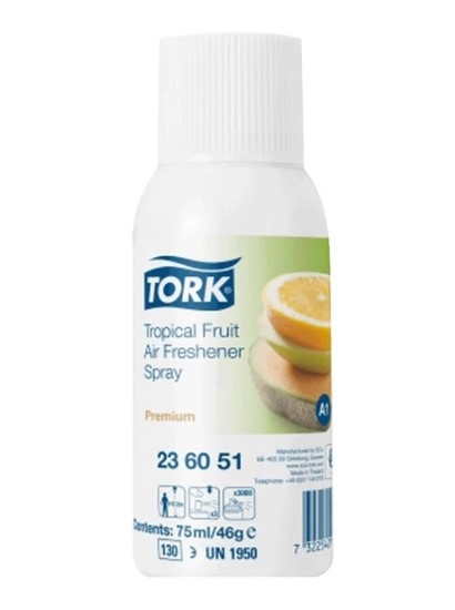 Frisk toiletmiljøet op med en behagelig tropisk duft. Kombiner duftfriskeren med Tork Airfreshener Dispenser A1.